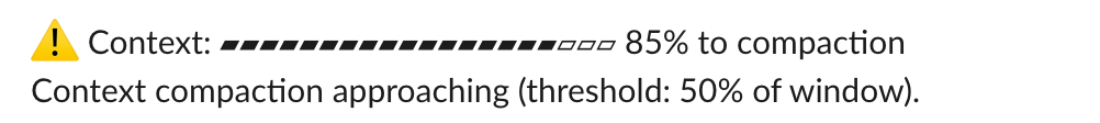 Hermes Agent’s warning on context window status is helpful (for advanced users) as well, so you can manually compact context if needed.