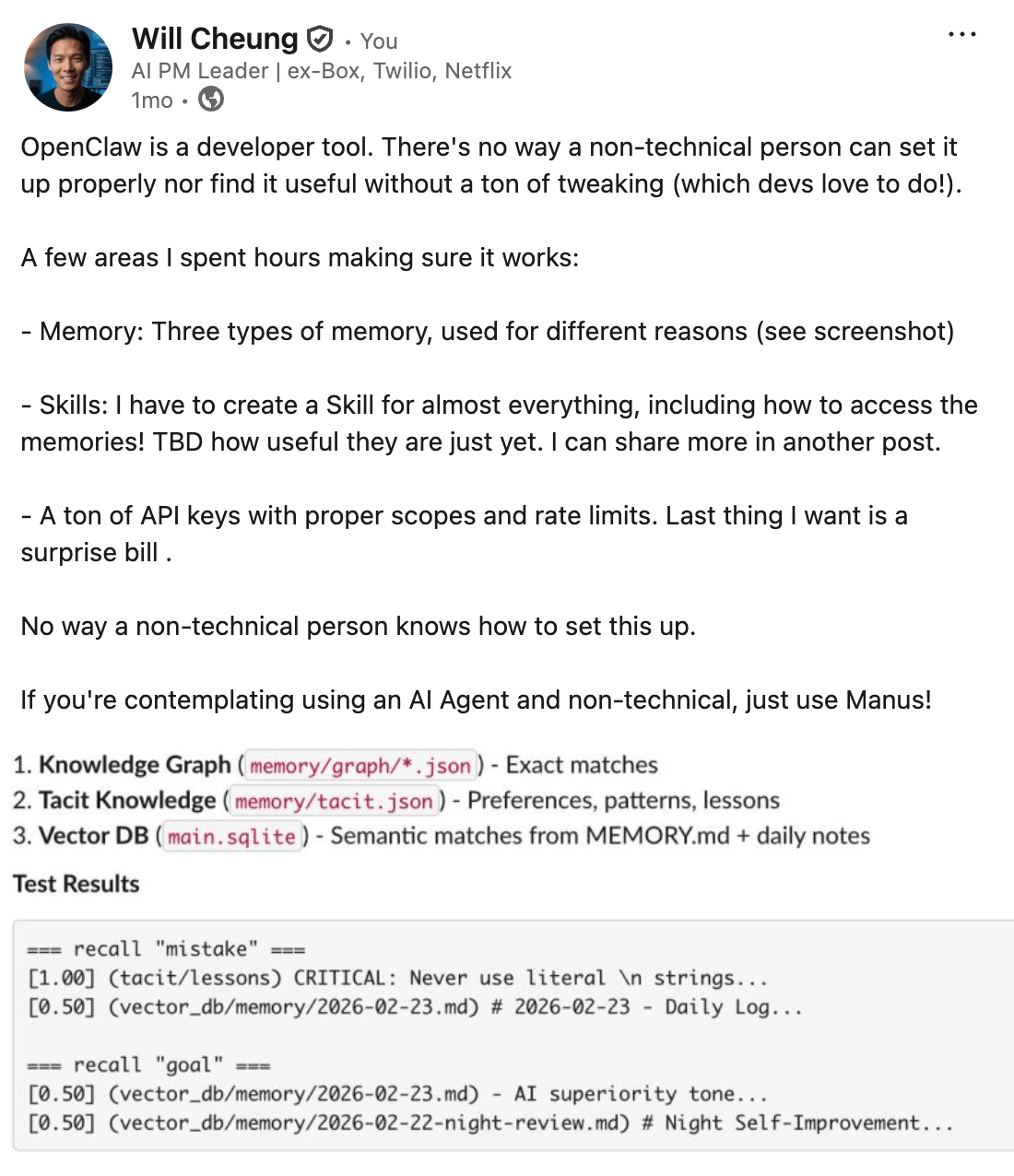 But soon enough, I hit a wall. OpenClaw forgets. My endless hours customizing it just breaks other things. My custom "skills" would vanish, or the memory would get so fragmented that the agent forgot who I was by Tuesday. The worst part is that I can’t “debug” because I have no idea what it’s doing in the background.
