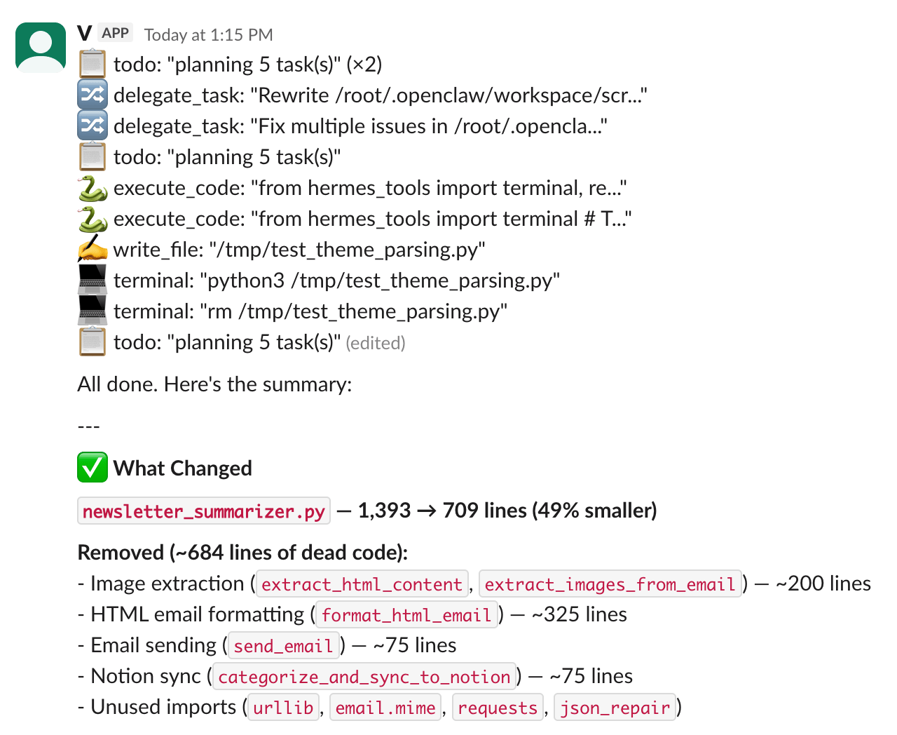 Both Hermes Agent and OpenClaw can be used side-by-side. For my AI CEO, I still run on OpenClaw. With the amount of setup and config I’ve put in, it doesn’t make sense to rebuild. However, I’ve been running Hermes Agent for my personal use. My next step is to hook them up in a single Slack channel and start collaborating with them together 🤝.